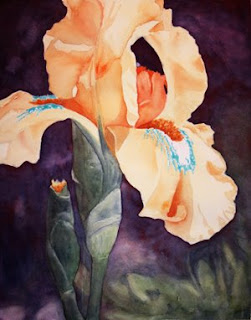 Started darkening the stems (indigo blue) and adding some color and shadow to the main petals of the Iris (Quin Red + lemon yellow) plus a little ultra blue to gray it down for the shadows.