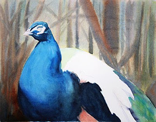 Added more shadow on the main part of the peacock and started building the background wet in wet. I will go back into the background and finish it before finishing the bird, hoping to get this done soon I am drawing out 2 commissions I am starting on next ๐